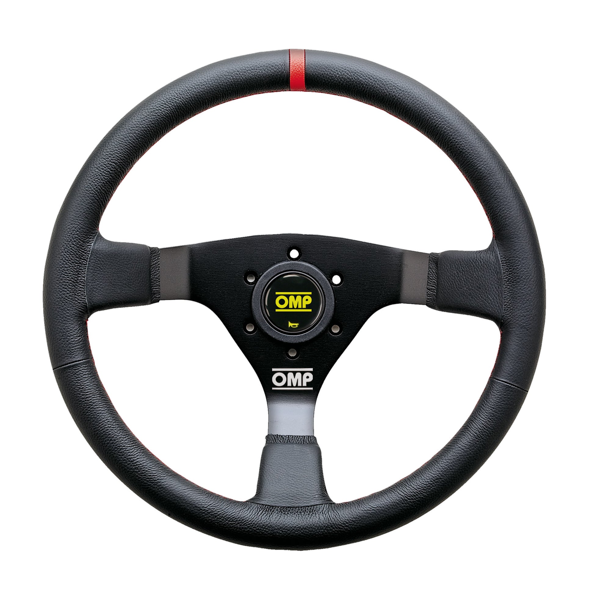 Dished steering wheel with 3 black anodized spokes. In smooth leather. Yellow stitching. Supplied with horn button. Depth 70 mm.
