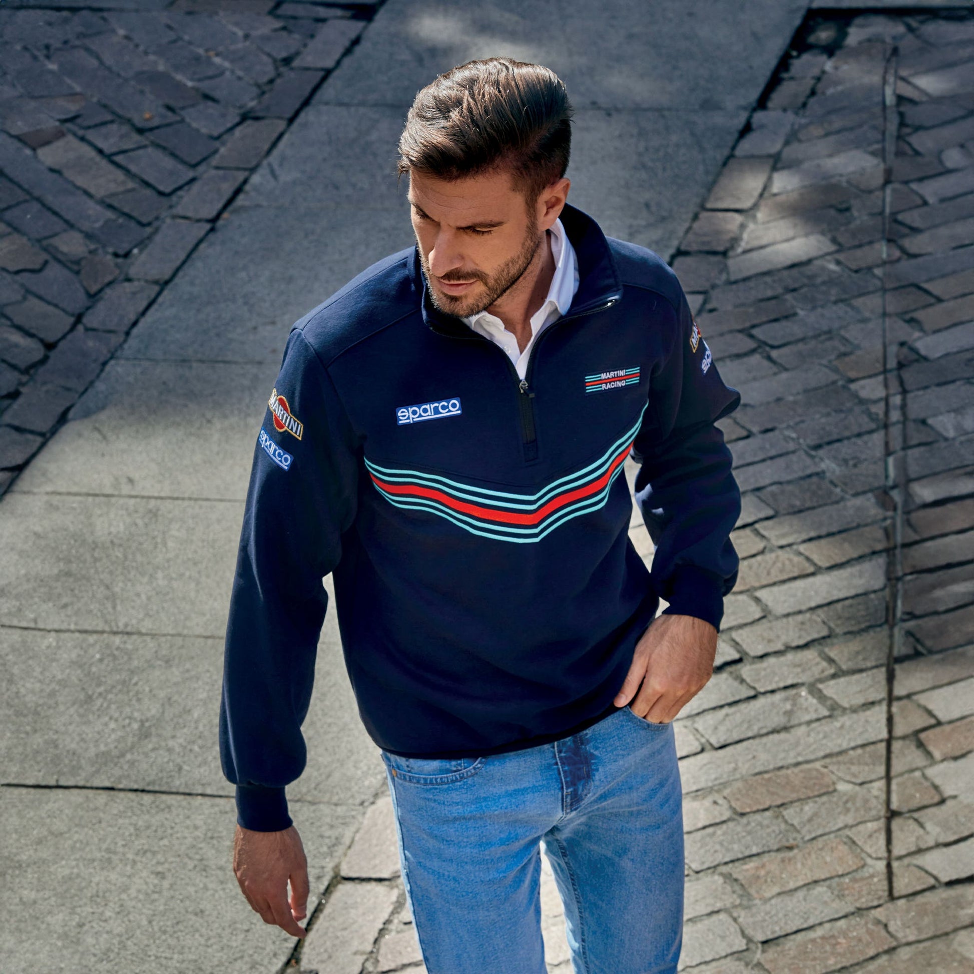 Half zip sweatshirt inspired by the iconic Sparco - Martini Racing suit. Embroidered logos.