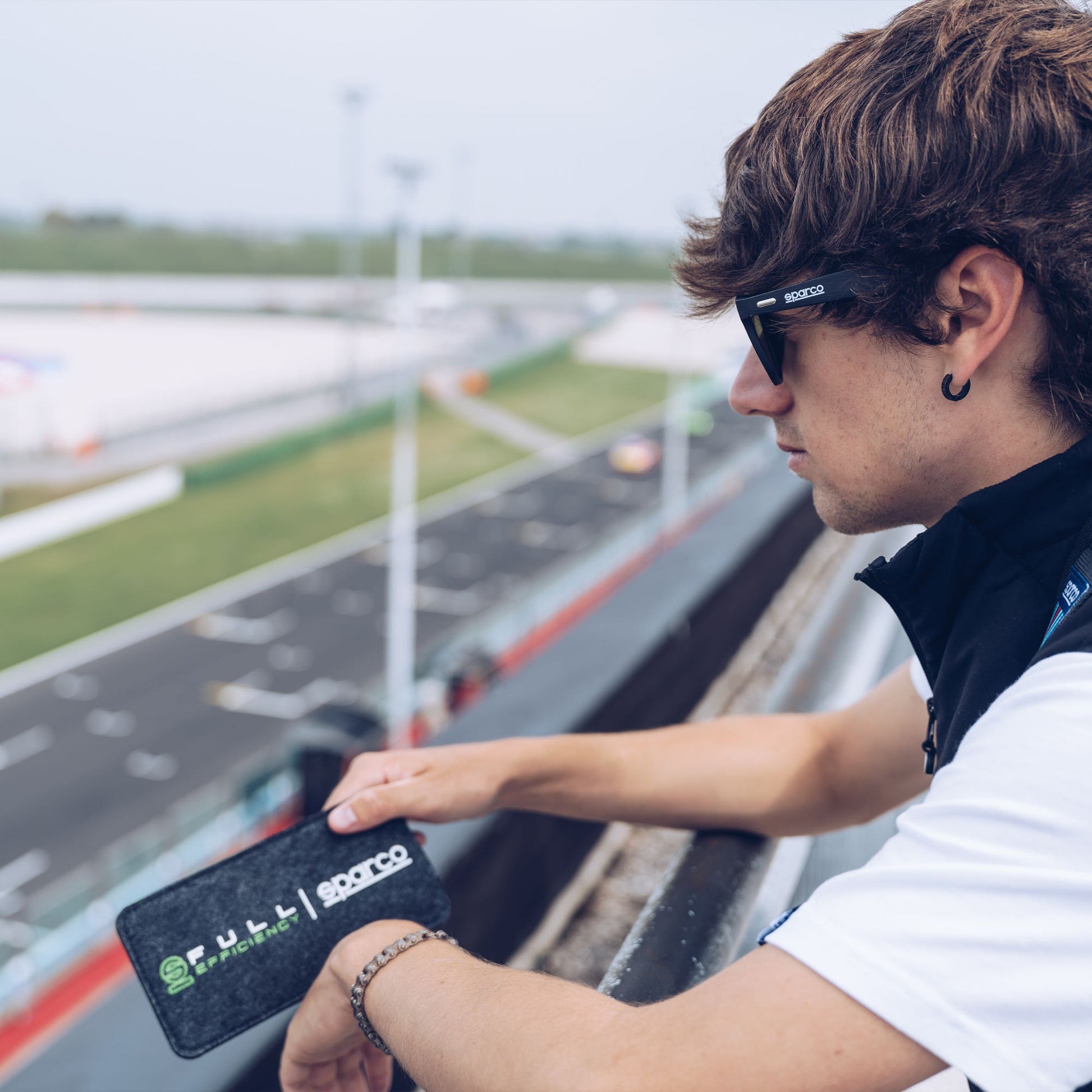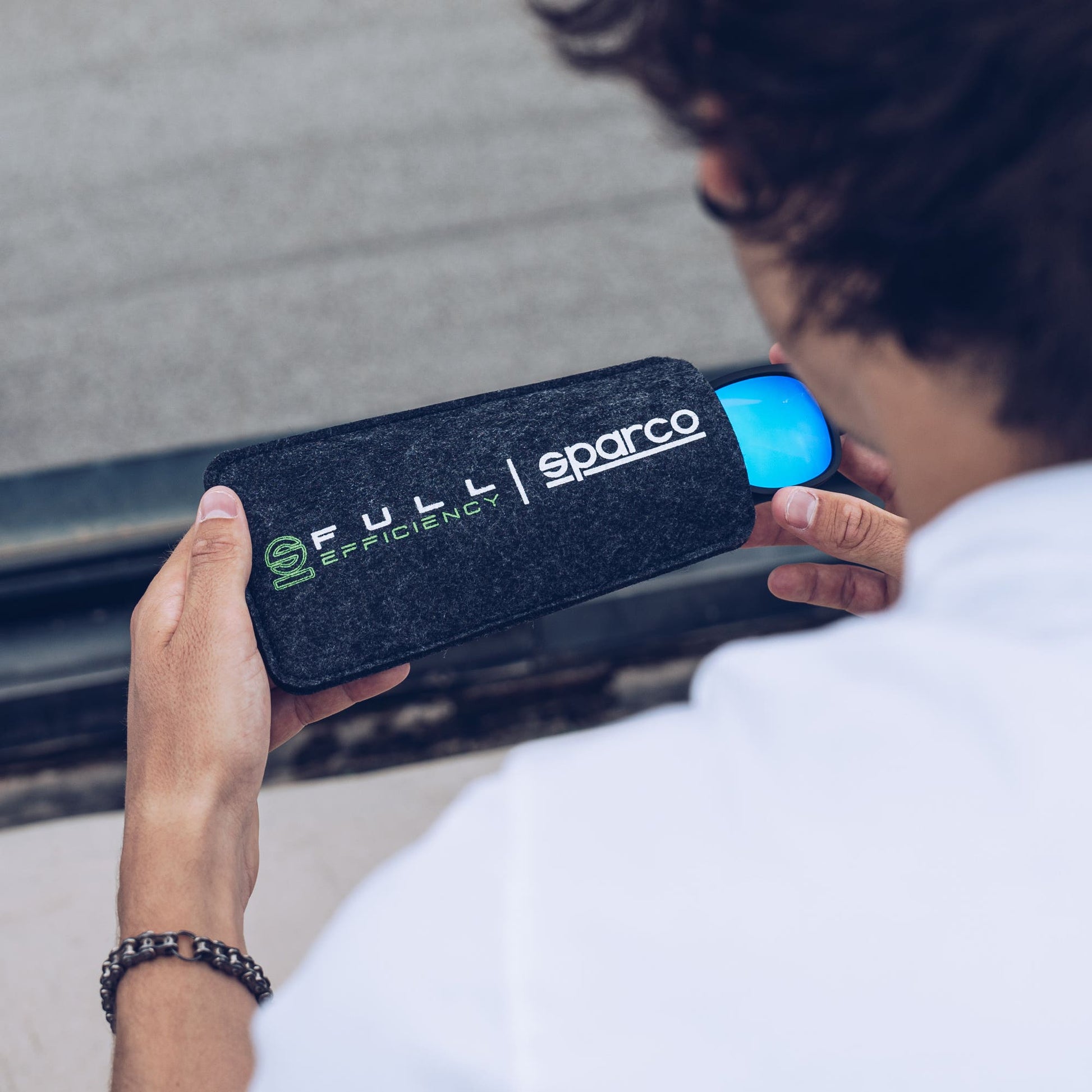 Together with the glasses, you will receive a practical case made of 100% recycled RPET felt, decorated with the 'FULL EFFICIENCY' print. The FULL-Efficiency project represents Sparco's commitment to a sustainable production cycle, using at least 51% regenerated materials to reduce waste and protect the environment. Perfect for those looking for a fashionable accessory that respects the environment.